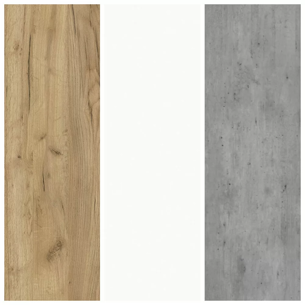Сочетание холодных матовых урбанистических оттенков декора «Метрополитен Грей» и изысканного блеска декора «Белый» оттенено древесной текстурой корпуса «Крафт».