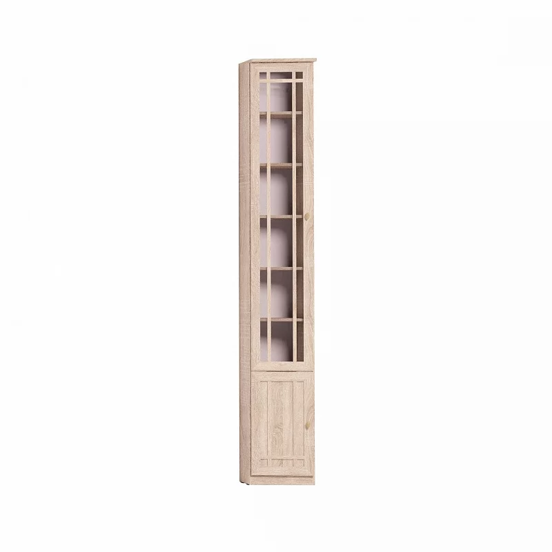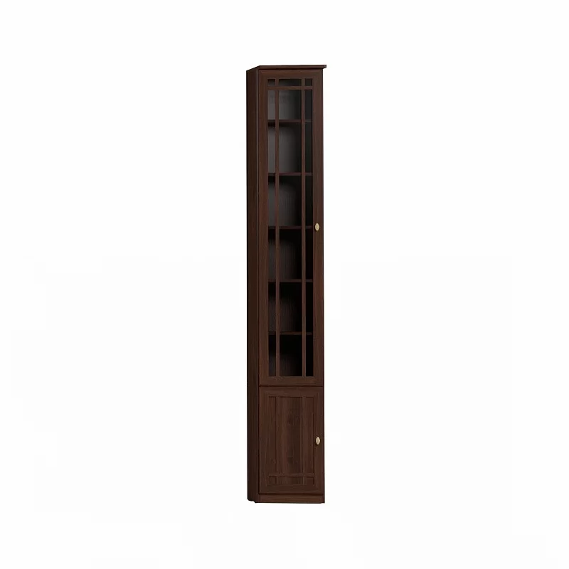 Высокий библиотечный шкаф со скосом влево гармонично завершает компоновку из шкафов библиотеки Sherlock, глубина зауженной части составляет 170 мм. Шкаф со скосом вправо называется Sherlock 35 Шкаф для книг. Библиотечный шкаф можно установить в комнату с высотой потолка не менее 240 см. Высота полок во всех шкафах для книг регулируется, для этого необходимо только установить полкодержатели на нужной высоте в подготовленные отверстия. Это позволит поставить на полки книги и альбомы разного формата. Нагрузка на одну полку не должна превышать 13 кг. Тонированное стекло защищает книги от вредного воздействия солнечных лучей и убережет их от пожелтения. Книжный шкаф обязательно крепится к стене за подвесы и межсекционной стяжкой с другими шкафами в наборе. Библиотека выпускается без выборки под плинтус, чтобы каждый мог прирезать плинтус индивидуально.