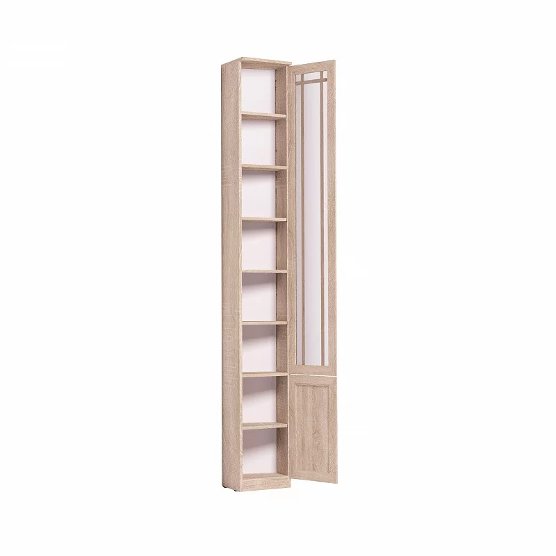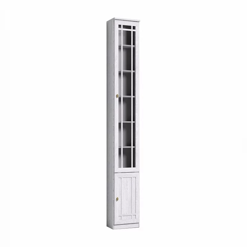 Высокий библиотечный шкаф со скосом влево гармонично завершает компоновку из шкафов библиотеки Sherlock, глубина зауженной части составляет 170 мм. Шкаф со скосом вправо называется Sherlock 35 Шкаф для книг. Библиотечный шкаф можно установить в комнату с высотой потолка не менее 240 см. Высота полок во всех шкафах для книг регулируется, для этого необходимо только установить полкодержатели на нужной высоте в подготовленные отверстия. Это позволит поставить на полки книги и альбомы разного формата. Нагрузка на одну полку не должна превышать 13 кг. Тонированное стекло защищает книги от вредного воздействия солнечных лучей и убережет их от пожелтения. Книжный шкаф обязательно крепится к стене за подвесы и межсекционной стяжкой с другими шкафами в наборе. Библиотека выпускается без выборки под плинтус, чтобы каждый мог прирезать плинтус индивидуально.