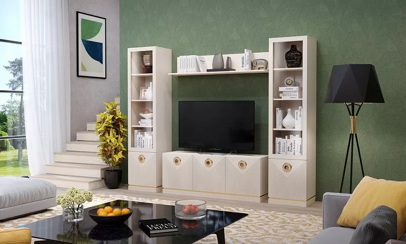 - конструкция модуля предполагает возможность закрытого и открытого хранения, за стеклодверью предусмотрены три полки, где можно поместить красивые сувениры, книги и фото, а в нижней части закрытое отделение с дверкой;