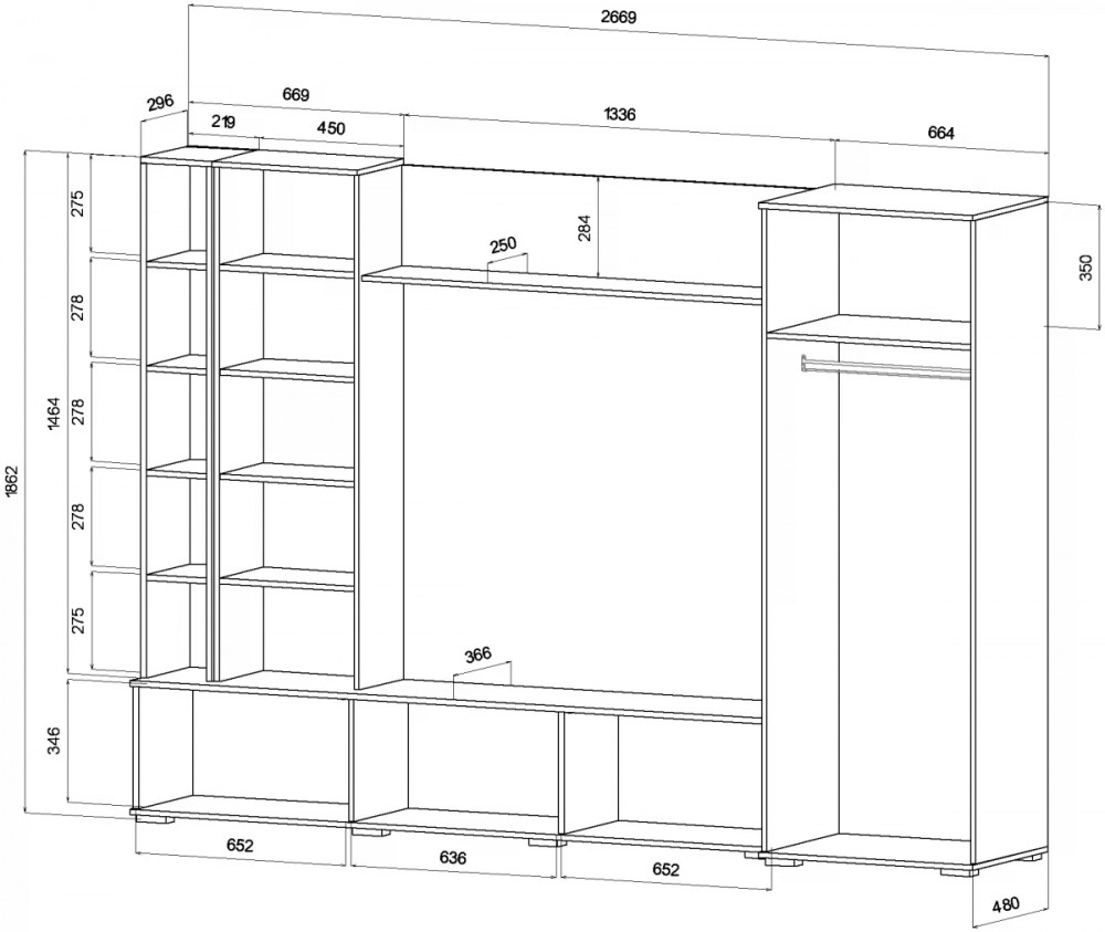 • Габариты: 2669 (ширина) х 480 (глубина) х 1862 (высота) мм.