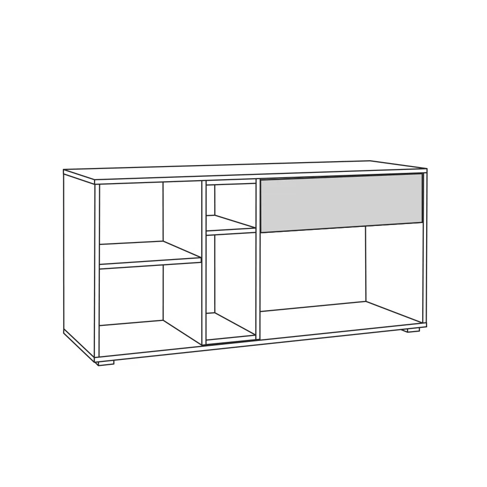 Тумба ТВ "Бэль" №10.91 разделена на три отделения. В левом за распашной дверкой находится полка, центральное также разделено на две ниши. Правое занимает выдвижной ящик и секция с откидной дверкой.