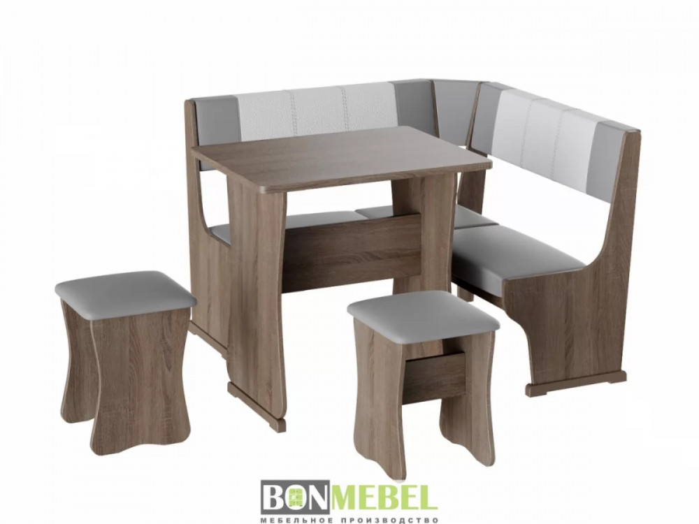 Небольшой оригинальный уголок для кухни. Такая модель выглядит изящно и современно, она придется по вкусу тем, кто любит уют и комфорт. Сборка скамьи универсальная, вы определить угол как с правой, так и с левой стороны. Обивка на табуретах и скамье выполнена из искусственной кожи с наполнителем из поролона. Каркас изделий изготовлен из ЛДСП, на ножках установлены пластиковые накладки. Конструкция не оснащена ящиком для хранения.