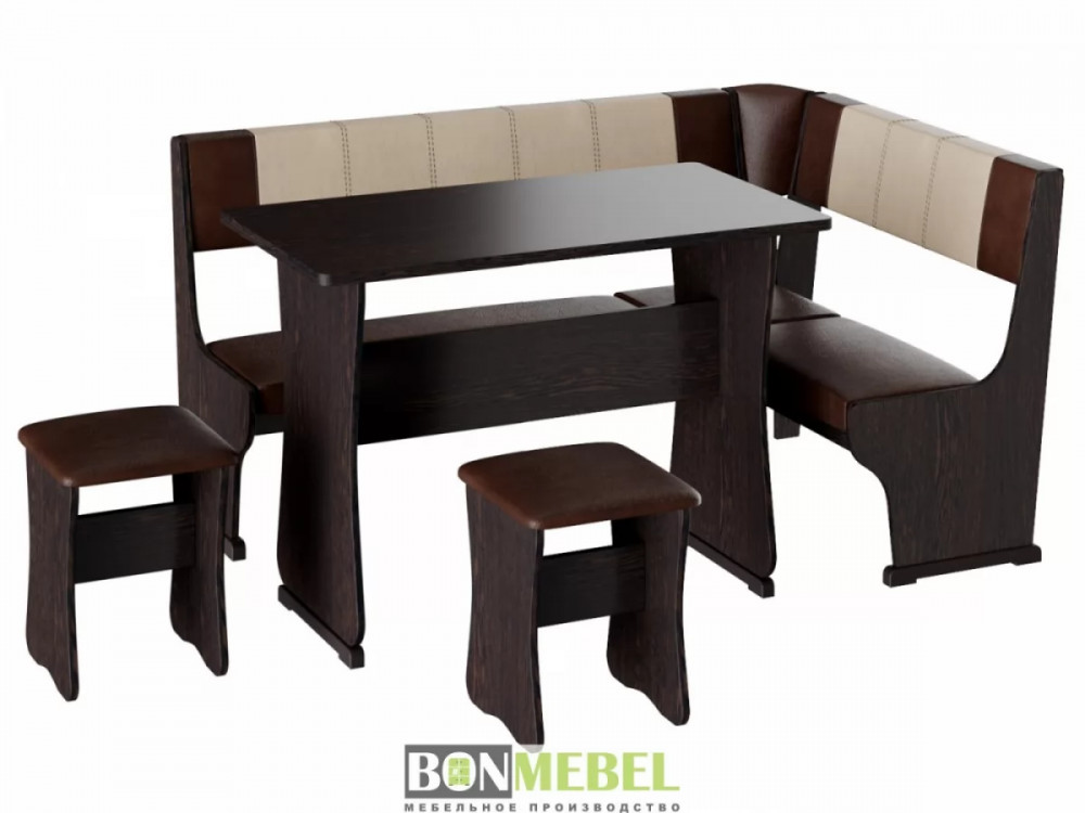 Кухонный уголок Гамма тип 1 с обеденным столом и двумя табуретами в комплекте. Набор идеально подойдет для оформления небольшой кухни дома и на даче. Угловая скамья универсальна по сборке. Обратите внимание! Ящики для хранения под сиденьями скамьи не предусмотрены. Каркас уголка, табуретов и стола изготавливаются из ЛДСП. Для обивки используется экокожа.