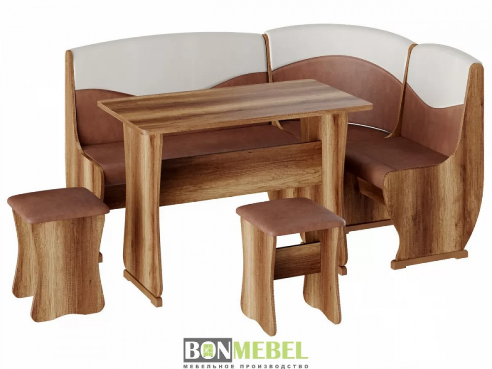 Кухонный уголок Уют тип 2 с обеденным столом и двумя мягкими табуретами. Каркас уголка, стол и табуреты изготавливаются из ЛДСП. Универсальный тип сборки — скамью можно собрать как длинной стороной слева, так и справа; ящики под сиденьями — полезная деталь для хранения мелочей на кухне; обивка из экокожи — практичная и легкая в уходе, особенно на кухне.