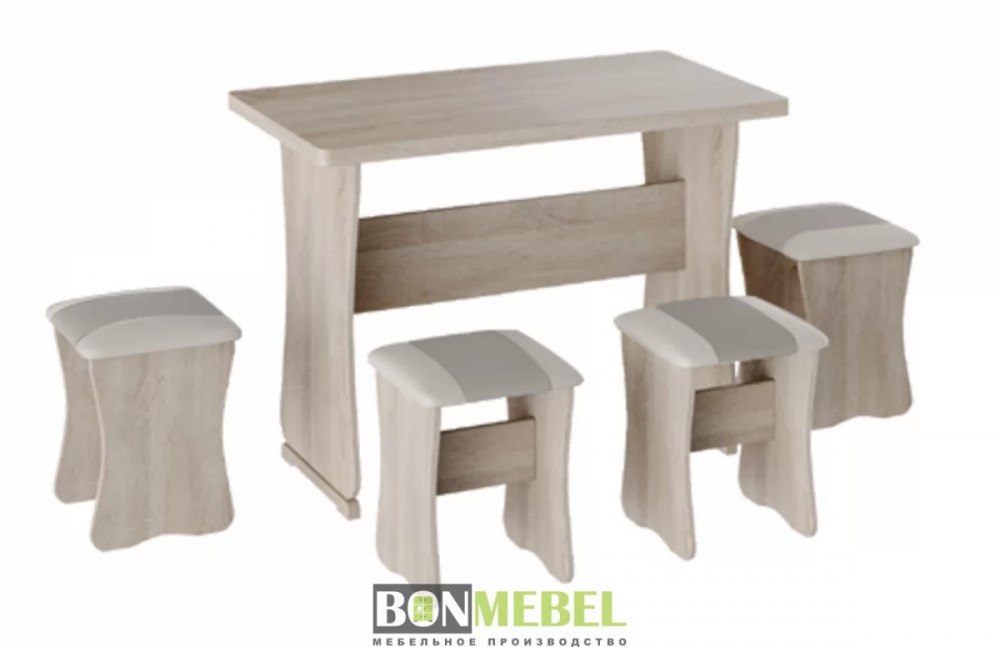 Обеденная группа с табуретами Тип-1 поможет организовать небольшую, но вместительную обеденную зону для четырех человек. Обивка из экокожи устойчива к различным загрязнениям и не требует обработки специальными средствами. Мягкие сиденья табуретов имеют мягкое и упругое наполнение, что повышает уровень комфортабельности. Различные варианты расцветки помогут подобрать идеальный комплект. Для изготовления изделий используется прочная ЛДСП. Обивка табуретов выполнена из искусственной кожи.