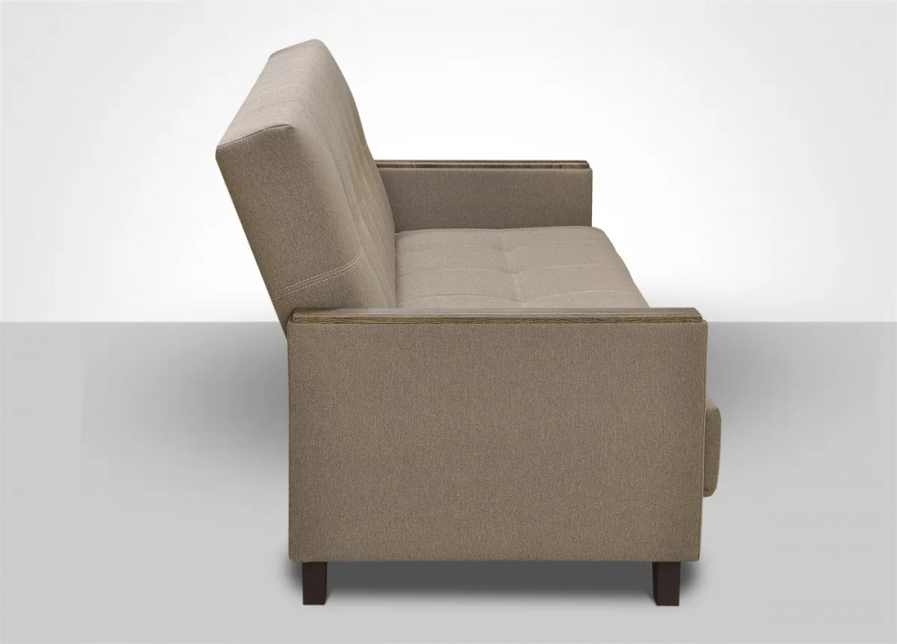 Минималистичный дизайн с прямоугольными  узкими подлокотниками, практичная накладка из ламинированного МДФ под дерево, 10 утяжек пуговиц, контрастная отстрочка.