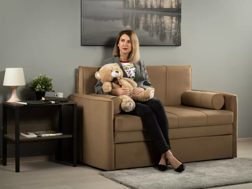 Диван-кровать Мелани Р (120) - компактный современный диванчик. Скругленные подлокотники с кантами подчеркивают эргономичность модели. Простой и надежный механизм трансформации на каждый день обеспечит удобным спальным местом ребенка или подростка. Может использоваться в качестве гостевого спального места для взрослого. Размер сп. места 195 х 120 см, есть небольшой бельевой ящик. Диван выполнен в мягком фактурном велюре. "Пальчиковый эффект" на ткани обивки выражен средне. Опоры - цвет черный, круглые, высота 25 мм., выполнены из высококачественного пластика. Прочность конструкции ножек обеспечена ребрами жесткости и внутренним креплением под фурнитуру.