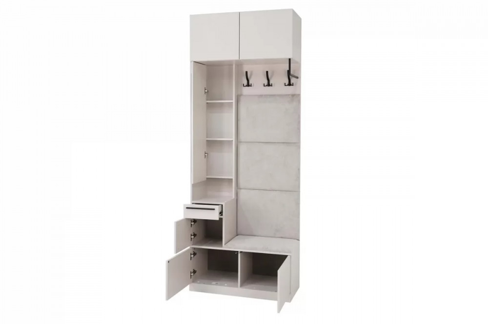 Размеры Ширина - 900 мм Глубина - 400 мм Высота - 2400 мм Вес: 74.6 кг Объём: 0.124 м3 Размеры упаковок 1984*684*32 902*438*80 896*396*120 1058*296*20 ЛДСП 16 мм Кромка ПВХ 1 мм Шариковые направляющие Петли с доводчиками Ручки металл: черные матовые или сатиновое золото