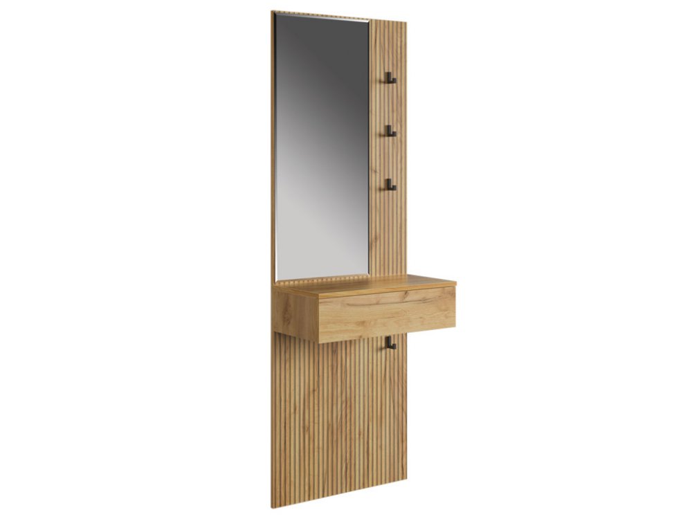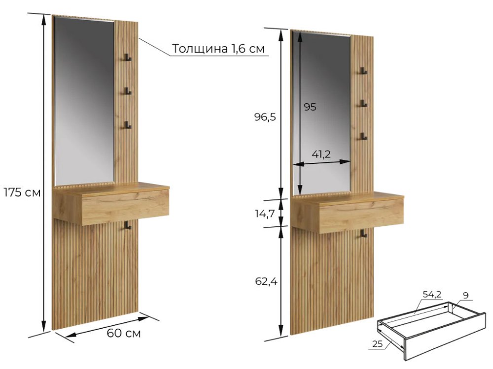 Крючки предоставляют удобное место для хранения сумок или аксессуаров. Выкатной ящик служит дополнительным пространством для хранения мелочей, таких как ключи, кошелек, косметика или другие небольшие предметы.