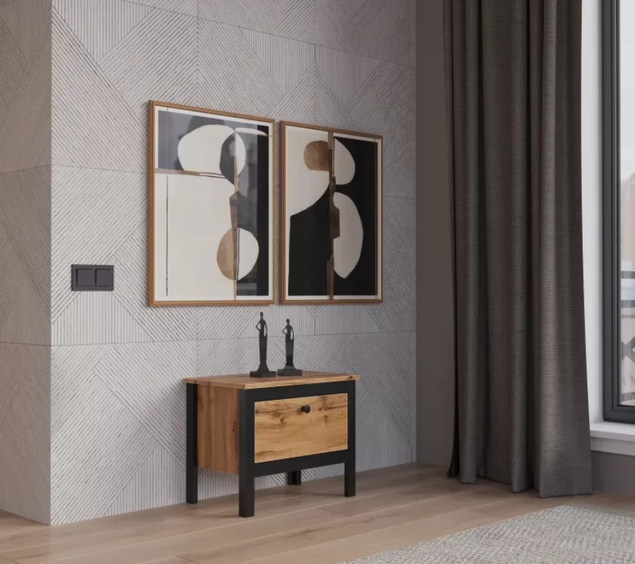 Модель выполнена из ЛДСП и проста в уходе. Достаточно протереть поверхность от пыли сухой тканью или слегка влажной тряпкой при устойчивых загрязнениях. Сочетание черного матового и древесного цветов делают этот модуль отличным решением для современных интерьеров.