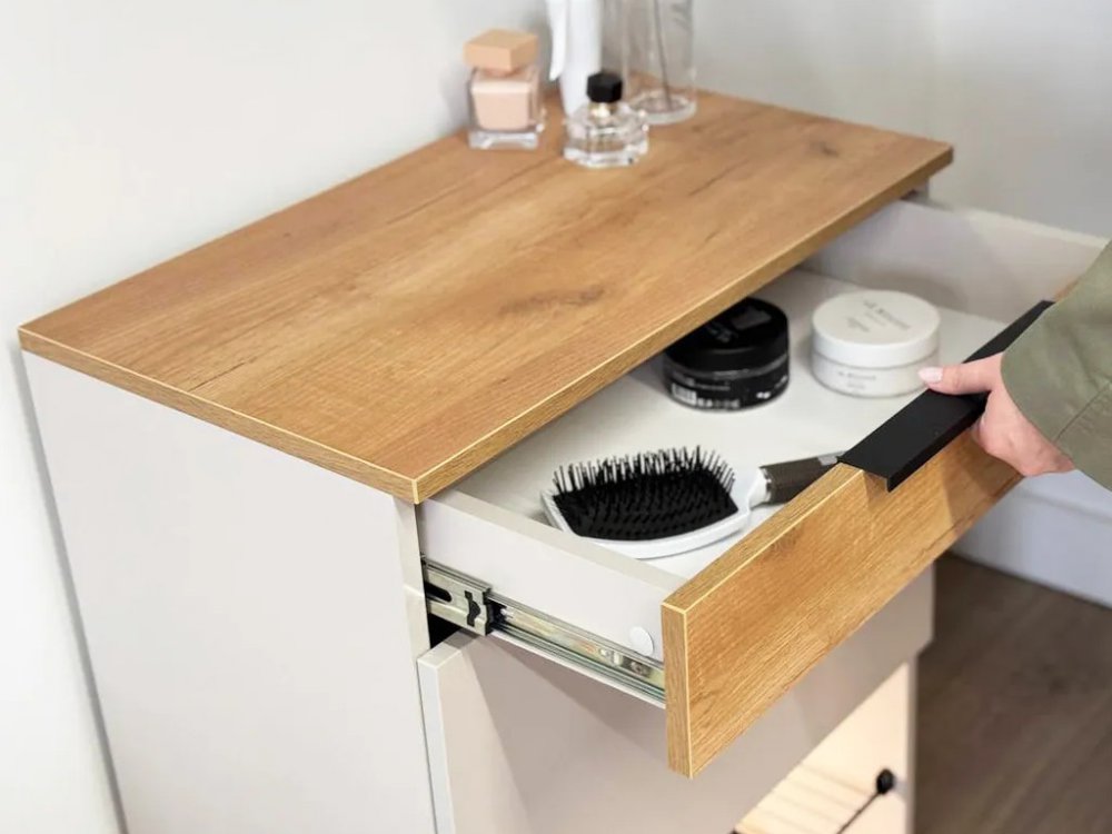 Изготовленная из прочного ЛДСП толщиной 16 мм, обувница обеспечивает надежность и долговечность. Выкатной ящик на шариковых направляющих позволяет легко и плавно открывать и закрывать его, предоставляя дополнительное место для хранения мелочей.