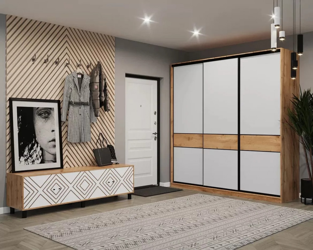 – Шкаф-купе выполнен из ЛДСП цвета Дуб Вотан с белым наполнение внутри (полки/перегородки), что позволяет быстро найти вещи и поддерживать чистоту!