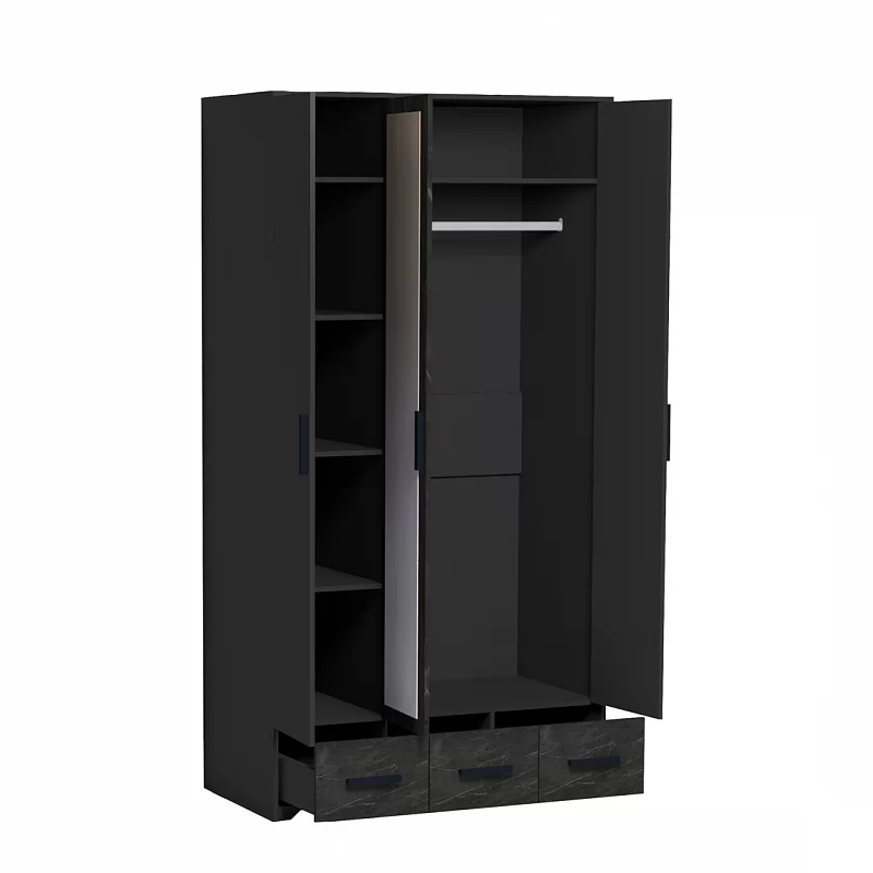 Трехстворчатый шкаф для одежды и белья Айрис 444 с зеркалом и выдвижными ящиками — находка для большой и маленькой спальни. Функциональное наполнение шкафа разделено, что очень удобно для зонирования гардероба всех членов семьи. Шкаф оснащен отделением для хранения белья с полками на скрытых полкодержателях и отделением для одежды со стационарной штангой 758 мм. 3 выдвижных ящика комплектуются шариковыми направляющими, что обеспечивает минимальный люфт ящиков и максимальное использование их площади. Петли с доводчиками для бесшумного закрывания дверок шкафа. Зеркало на фасаде шкафа.