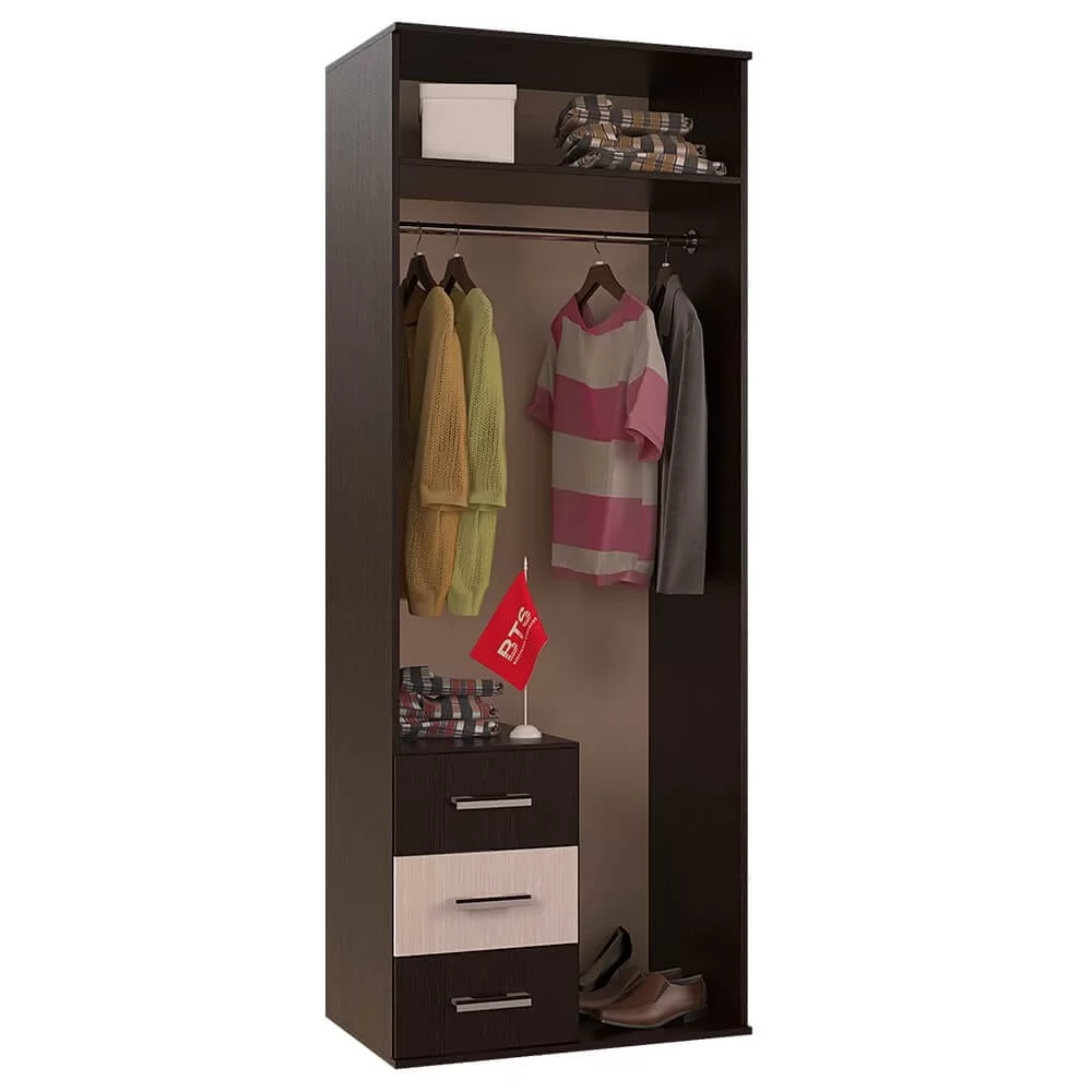 - модель имеет отделение с хромированной штангой для одежды на вешалках, - три выдвижных ящика для белья и аксессуаров, а также верхнюю полку, - на один из фасадов прикреплено высокое зеркало, - изделие выполнено из ЛДСП контрастных цветов венге и дуб аталанта, а также дополнено эргономичными ручками.