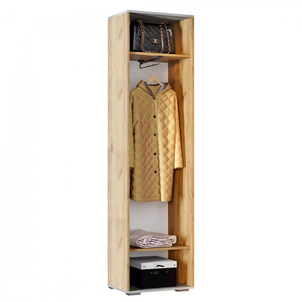 - модель выполнена из ЛДСП в цвете крафт с контрастной вставкой цвета бетон, - комплектация представляет собой отделение с выдвижной штангой для одежды на вешалках и полок для вещей и аксессуаров.