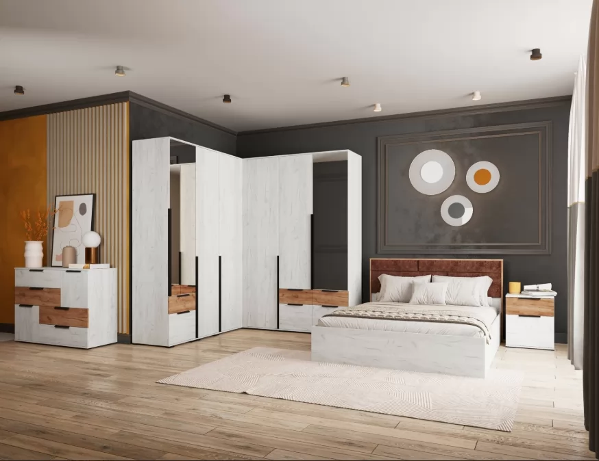 Увеличенная высота шкафов. 4 варианта основания для кровати: настил из ДСП 2С, настил из ЛДСП, ортопедическое основание на опорах, ортопедическое основание с подъемным механизмом и ящиком для хранения белья, внутреннее наполнение шкафа ЛСШ-23 — полки, выдвижные ящики и штанга стационарная металлическая.