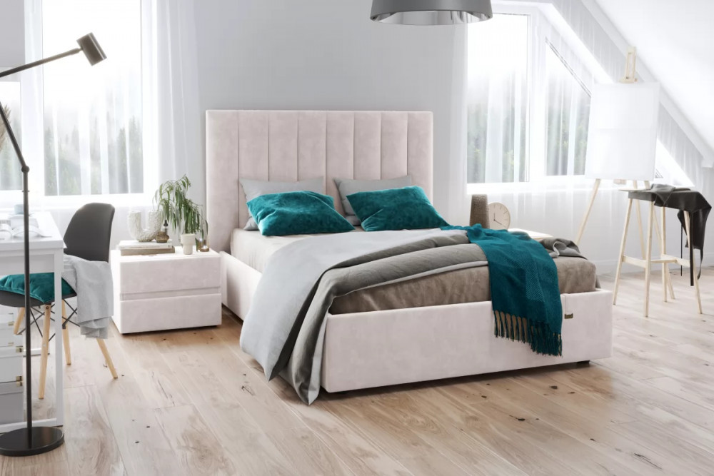 Кровать «Ingrid» подойдет для современных интерьеров спален, впишется в стиль ретро и скандинавский минимализм. Обивка будет отлично сочетаться с любыми цветовыми оттенками отделки и мебели. Кровати выполнены в нейтральных и ярких тканях велюр, что позволяет подобрать подходящий вариант почти под любой интерьер. Изголовье имеет прямоугольную форму, повторяя очертания кровати. Дизайн модели отличается высоким изголовьем с вертикальными строчками и углублениями.