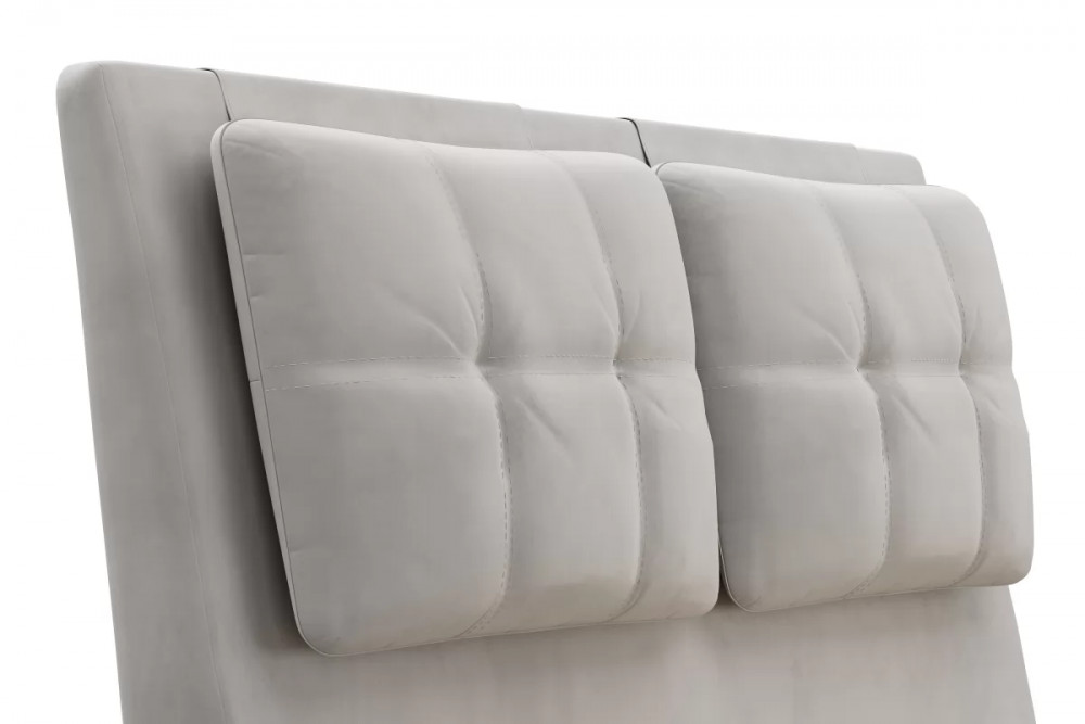 Кровати выполнены в нейтральных и в ярких тканях велюр, что позволяет подобрать подходящий вариант почти под любой интерьер. В качестве декора применяются декоративные подушки на изголовье.